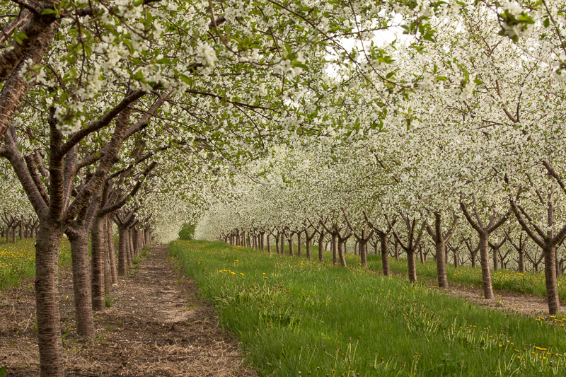 We waited a long time for cherry blossoms this year, only being a day shy of setting a record for lateness. But it was worth the wait because the blossoms are gorgeous this year. I especially enjoy photographing cherry blossoms because they offer opportunities for so many kinds of photography. White blooms covering a hillside make for a lovely landscape. Delicate cherry blossoms invite close-up photography. Interesting patterns often emerge from the symmetry of the orchards. In this particular set of images, I was as engrossed with the bark patterns in the trees as I was with the blossoms themselves. And nothing ends a day of shooting better than a delicately colored sky at sunset. This photo-shoot had it all.