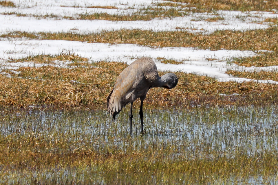 While the crane worked at preening itself, various scenarios ran through my mind. Perhaps, the mate had died at the hands of a predator, such as a fox, raccoon, coyote, eagle, or owl. If that was the case, the lone crane would be looking for a new mate, but typically not until migration time.