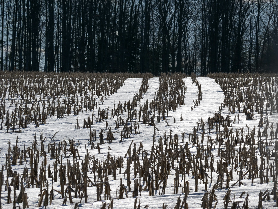 Not much had changed since my visit to the area a week ago. Deep snow remained in the fields of corn stalks. Not very springlike at all.