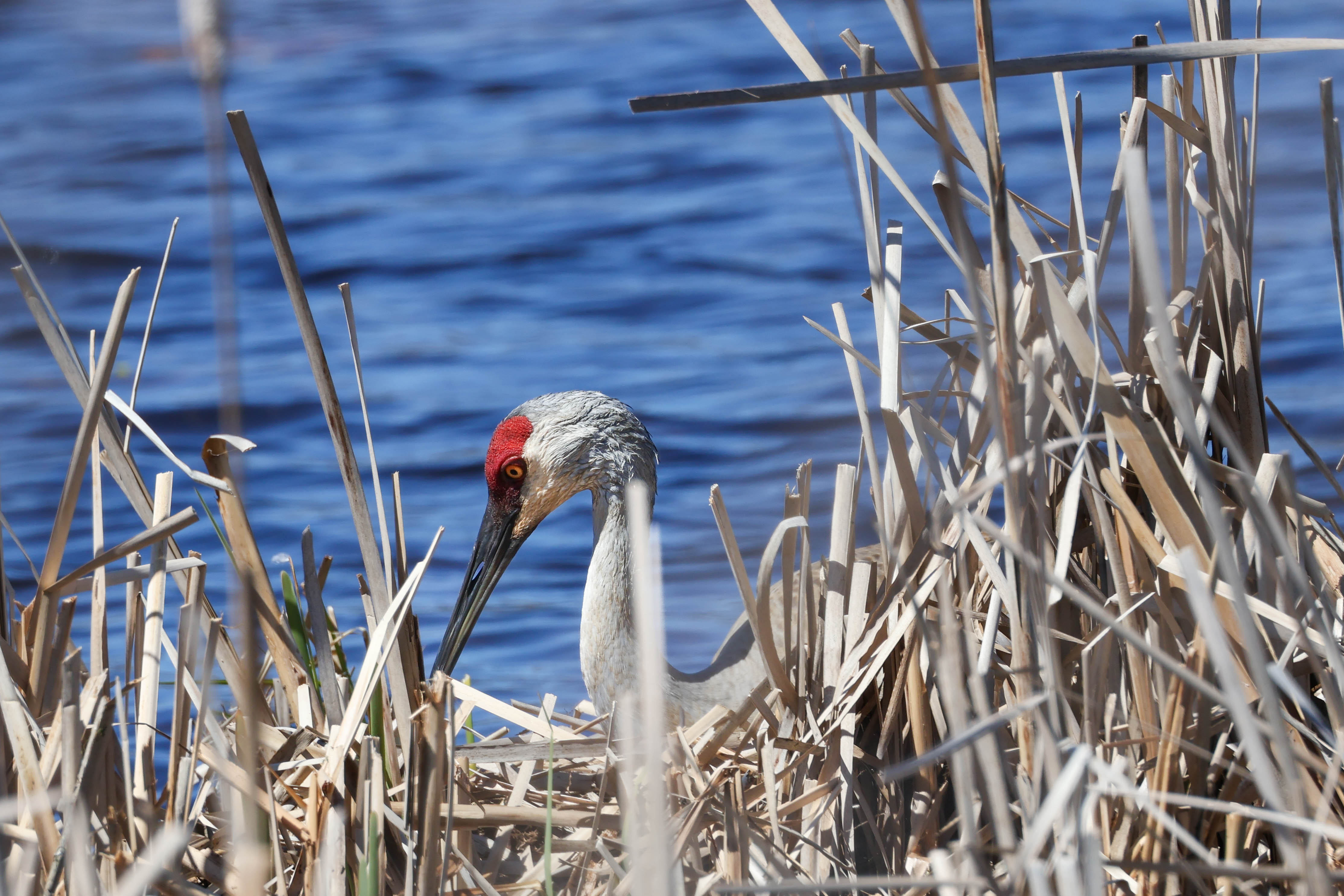 On my next outing with friends Don and Diana, we headed to the Lakeshore where we’d seen cranes in a wetland at the base of the Dune Climb. We were lucky again as the pair was nesting not far from the roadside. One crane moved around in the water, preening and distracting us from the mate sitting low on the nest. We watched a while then moved on, hoping to be back to see chicks sometime soon.